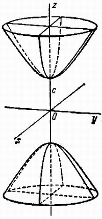 Гиперболоид, определяемый уравнением (2), называется однополостным (рис. 2); гиперболоид, определяемый уравнением (3), - двуполостным (рис. 3); уравнения (2) и (3) называются каноническими уравнениями соответствующих гиперболоидов. Величины a, b, c называются полуосями гиперболоида. В случае однополостного гиперболоида, заданного уравнением (2), только первые из них (а и b) показаны на рис. 2. В случае двуполостного гиперболоида, заданного уравнением (3), одна из них (именно, с) показана на рис. 3. Гиперболоиды, определяемые уравнениями (2) и (3), при a=b являются поверхностями вращения.