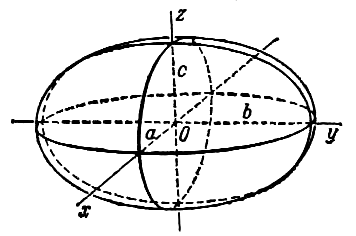Уравнение (1) называется каноническим уравнением эллипсоида. Величины a, b, c суть полуоси эллипсоида (рис. 1). Если все они различны, эллипсоид называется трехосным; в случае, когда какие-нибудь две из них одинаковы, эллипсоид называется вытянутым, при a=b>c - сжатым. В случае, когда a=b=c, эллипсоид представляет собой сферу.
