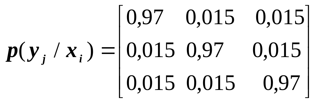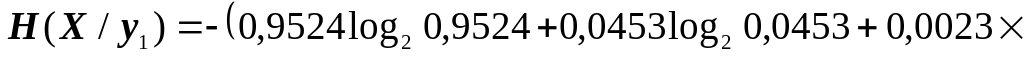 H(Y/x3)0,593 (біт/сим); H(Y/X)0,385 (біт/сим); H(X/y1)0,289 (біт/сим); H(X/y2)0,383 (біт/сим); H(X/y3)1,148 (біт/сим); H(X/Y)0,369 (біт/сим).