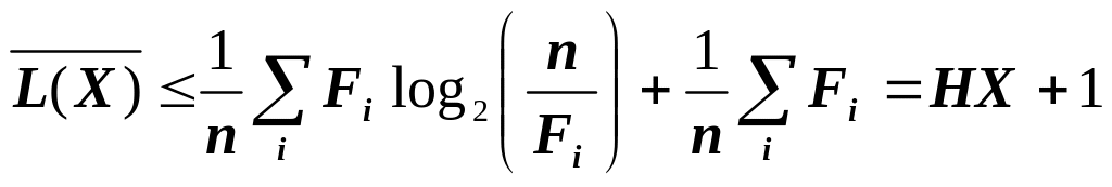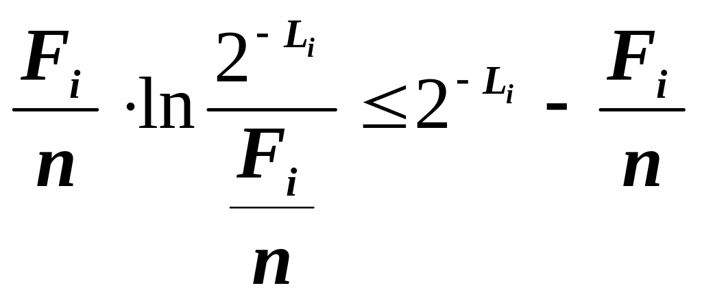 Запишемо суми за i обох частин нерівності (2.8), і з урахуванням того, що для оптимального кодування Хаффмена нерівність Крафта (2.1) переходить в строгу рівність, дістанемо в правій частині (2.8) нуль, отже,