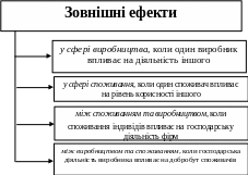 Зовнішні ефекти або екстерналії - це побічні наслідки економічної діяльності, які не регулюються ринком і впливають на інтереси третіх осіб як у сфері виробництва, так і у сфері споживання. Залежно від сфери прояву розрізняють зовнішні ефекти: