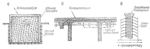 Рис. 17. Способы прогрева бетона зимой: а - способ «термоса»; б - паропрогрев; в - электропрогрев