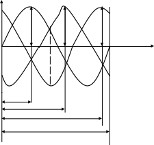 Изменение ЭДС в каждой фазе сети происходит по синусоидальному закону и сдвинуто в каждой фазе по отношению к предыдущей на 1/3 периода Т или на угол 120= 2/3, т.е.: