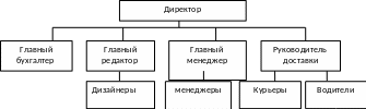 Структура компании (Рис. 1.) построена следующим образом: директор, которому подчиняются: главный бухгалтер, главный редактор, главный менеджер и руководитель доставки. В подчинении главного редактора находятся дизайнеры, главного менеджера- менеджеры по работе с клиентами. Руководителю доставки подчиняются курьеры и водители.