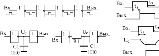Для задержки сигнала используются также конденсаторы. При этом задержка возникает из-за медленного заряда и разряда конденсатора (напряжение на конденсаторе — UC). Схема без резистора (слева на рисунке) дает задержку около 100 нс. В схеме с резистором (справа на рисунке) номинал резистора должен быть порядка сотен Ом. Но при выборе таких схем с конденсаторами надо учитывать, что некоторые серии микросхем (например, КР1533) плохо работают с затянутыми фронтами входных сигналов. Кроме того, надо учитывать, что количество времязадающих конденсаторов в схеме обратно пропорционально уровню мастерства разработчика схемы.