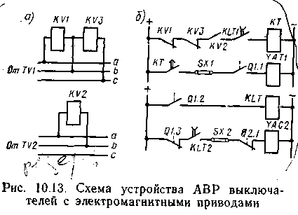 Устройства АВР на постоянном оперативном токе применяют в установках, имеющих выключатели с электромагнитными приводами, электромагниты отключения и тем более электромагниты включения которых потребляют сравнительно большие мощности. При этом схемы релейной защиты и схемы автоматики выполняют на постоянном или выпрямленном оперативном токе с использованием блоков питания и мощных выпрямительных устройств (рис. 10.13).