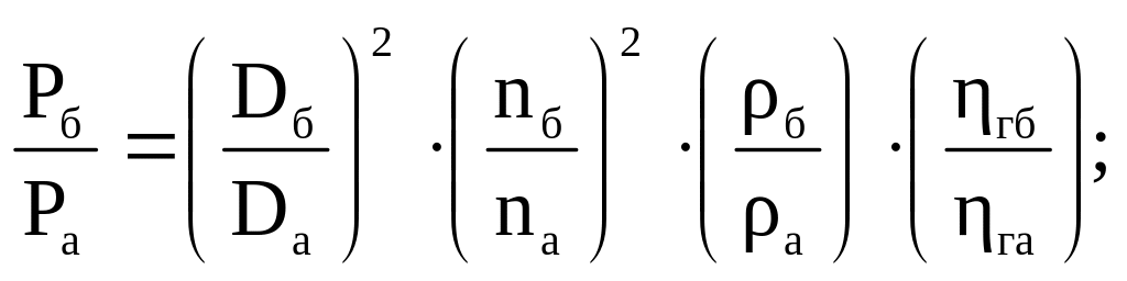 Для параметров нагнетателей, работающих в подобных режимах, справедливы определенные соотношения, называемые формулами подобия. Они позволяют, зная параметры в неком исходном режиме "а", вычислить предполагаемые значения тех же параметров для некого подобного режима "б". Приведем формулы подобия без вывода: