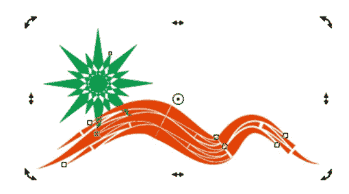 Вращение объектов в Corel Draw Для того чтобы применить к объектам преобразование вращения, можно воспользоваться в зависимости от конкретной ситуации мышью, панелью свойств или специальной панелью Rotate (Вращение). Чтобы повернуть выделенные объекты с помощью мыши, следует щелкнуть на одном из них еще раз. Маркеры выделения изменятся, как показано на рисунке 2. Перетаскивание одного из угловых маркеров-стрелок повернет выделенные объекты относительно центра, который теперь примет вид кружка с точкой в центре. По умолчанию центр вращения позиционируется в центр выделенной области, однако, его положение можно изменять, просто перетащив его мышью.