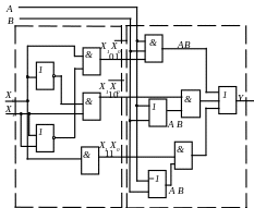 Рис. 5.4. Реалізация однорозрядного АЛП на логічних елементах для виконання логічних операцій кон'юнкції, диз'юнкції та Виключального АБО