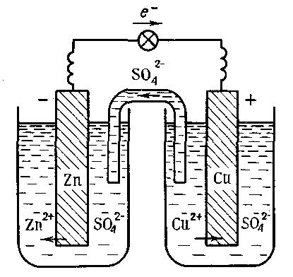 Ця реакція відбувається, наприклад, у гальванічному елементі, в якому цинкова пластинка (один електрод) занурена у розчин цинк сульфату, а мідна (другий електрод) — у розчин купрум(ІІ) сульфату. Сполучивши цинковий та мідний електроди з гальванометром і з’єднавши розчини U-подібною трубкою, заповненою розчином електроліту КNO3, дістають гальванічний елемент (елемент Якобі-Даніеля, рис. 5).
