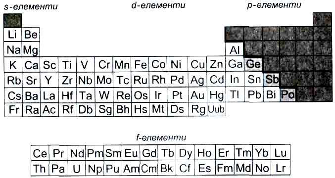 Металічних елементів існує значно більше, ніж неметалічних. До них належать усі d- і f-елементи, а також s-елементи (крім Гідрогену і Гелію) та кілька р-елементів. У довгому варіанті періодичної системи металічні елементи займають ліву і центральну частини: