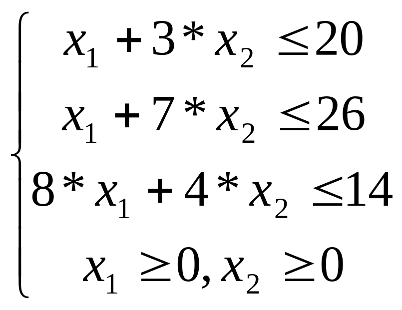 Обозначим через Х1 и Х2 количество продукции А и В, которую планируется произвести с использованием трех типов ресурсов. Стоимость произведенной продукции Z = C1X1 + C2X2. Мы должны определить X1 и X2 так, чтобы величина Z была максимальной. Переменные X1, X2 не могут принимать произвольных значений. Их значения ограничены условиями производства, а именно тем, что существует определенный запас каждого вида ресурса на изготовление продукции. На изготовление продукции А затраты по видам ресурсов: электроэнергия, сырье, оборудование; соответственно равны: X1, X1, 8* X1. На продукцию В соответственно: 3* X2, 7* X2, 4* X2. При этом должны выполнятся такие условия, где сумма затрат каждого вида ресурса, затраченного на производство продукции двух видов, не превышает количество реального запаса или равна запасам, т. е. при использовании электроэнергии неравенство выглядит следующим образом: X1 + 3* X2 20, соответственно для сырья и оборудования: X1 + 7* X2 26, 8* X1 + 4* X2 14. Кроме того, величины Х1, Х2 не могут быть отрицательными: Х1 0, Х2 0.