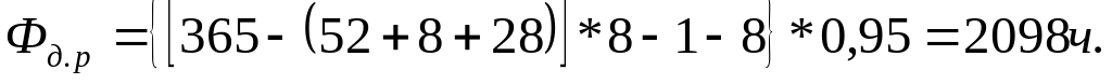 Действительный годовой фонд времени рабочего Фд.р, ч, учитывает фактически отрабатываемое время в течение года с учетом трудового отпуска, потерь рабочего времени по уважительным причинам и определяется по формуле