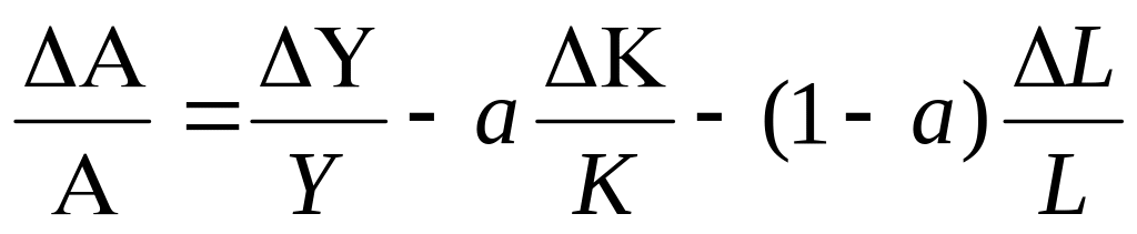 де ΔY/Y, ΔК/К, ΔL/L, ΔА/A ‑ темп приросту відповідних показників, а ‑ частка капіталу в продукті; (l-а) ‑ частка праці в продукті.