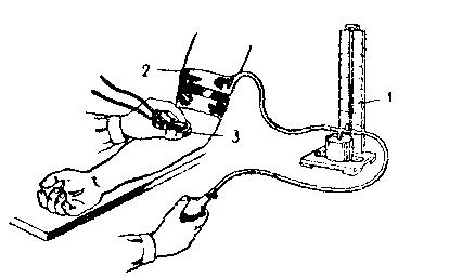 1- ртутний сфігмоманометр, 2- манжетка, 3- фонендоскоп.