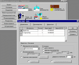 Данные о персонале подразделяются на три группы: управление, производство, маркетинг, каждая из которых помещается в соответствующей карточке диалога. Такое деление позволяет детализировать структуру издержек для целей анализа хозяйственной деятельности.