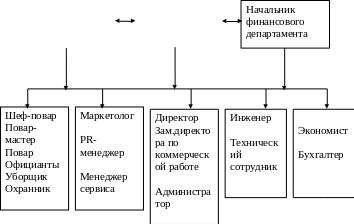 Генеральный директор осуществляет общее руководство всеми процессами в организации, координирует и контролирует через своих замов деятельность всех подразделений компаний. Начальник финансового департамента осуществляет руководство и контроль за финансовым состоянием организации (финансисты), управлением, мотивацией и координацией финансовым персоналом: ведения бухучета (бухгалтеры) и планированием деятельности (экономисты). Начальник коммерческого департамента занимается организацией коммерческо-маркетинговой деятельности в компании, координирует и контролирует руководителей предприятий общественного питания сети. Начальник технического департамента отводится управление через технический персонал (инженеры и технический сотрудники) все технологические, производственные и технические операции компании.