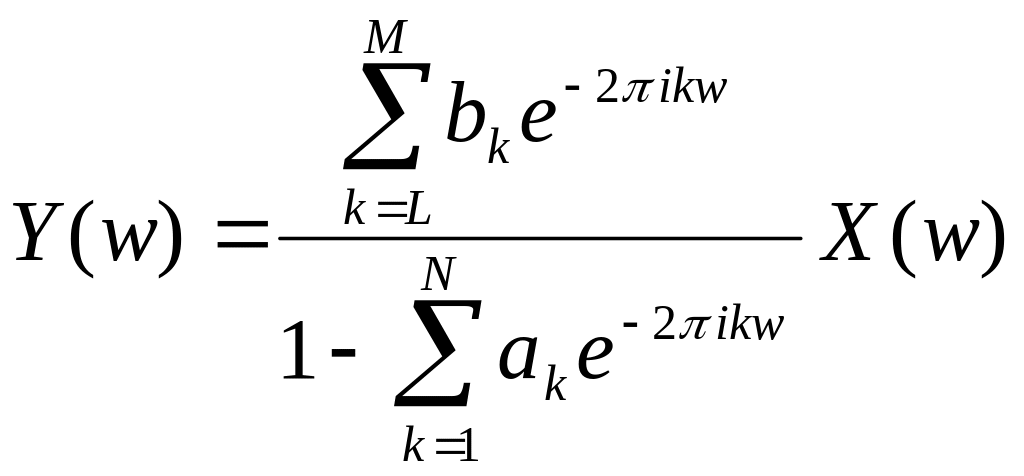 Фильтром с бесконечным временем отклика называется фильтр, определенный с помощью рекуррентного соотношения (5.6.2). Он может быть задан с помощью функции отклика . Последняя будет иметь бесконечное число ненулевых элементов, хотя и не может быть произвольной сходящейся последовательностью. Передаточную функцию находим, переходя в (5.6.2) к преобразованиям Фурье.