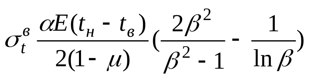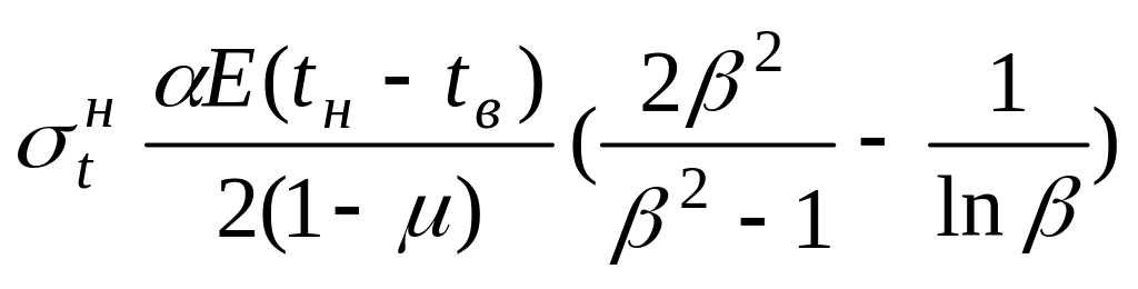 Температурные напряжения в стенках толстостенных аппаратов (у которых отношение наружного диаметра аппарата к внутреннему ( = Dн/Dв > 1,5) рассчитываются по формулам: