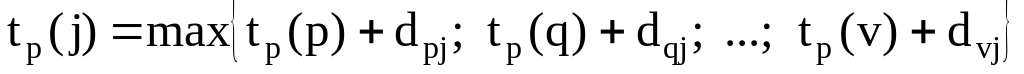 tp(1) = 0. Для узла j определим узлы p, q,…, v, которые связаны с узлом j работами (p, j), (q, j), …, (v, j) и для которых уже вычислены самые ранние сроки свершения начальных событий, тогда