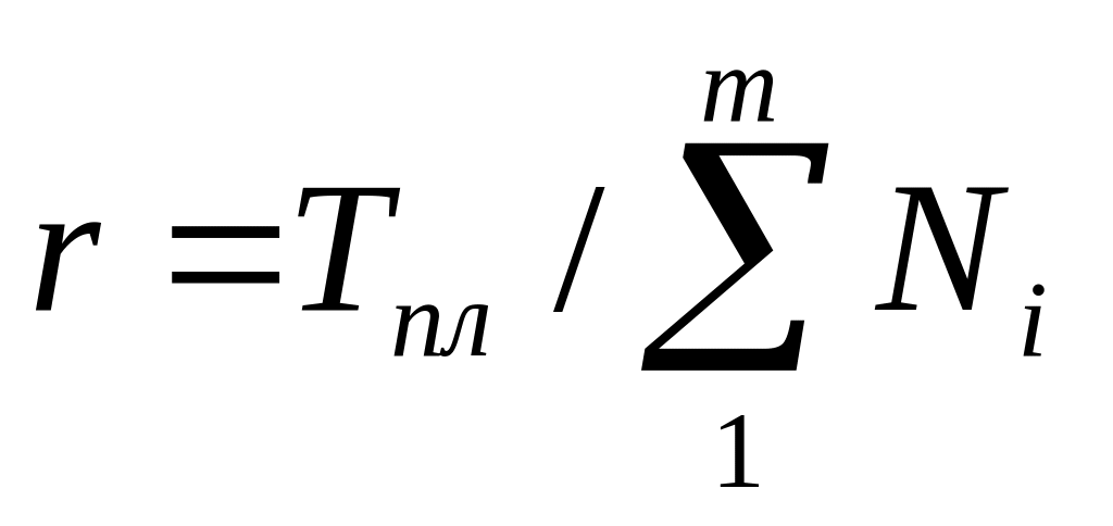 Тi – трудоемкость сборки i-го изделия; m- количество наименований изделий; Т- трудоемкость, выполняемых на одном месте за полный период (см. табл. 1);