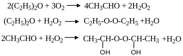 Простые эфиры легко окисляются даже кислородом воздуха с образованием различных взрывоопасных пероксидов и гидропероксидов, что ограничивает область их применения. Это следует учитывать также при их получении, хранении, аналитических испытаниях. Например, в этиловом (диэтиловом) эфире при самопроизвольном окислении кислородом воздуха могут происходить следующие процессы: