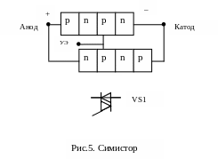 Симметричный тиристор (симистор) представляет собой двойную четырехслойную полупроводниковую структуру, показанную на рис.5.