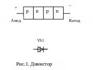 Неуправляемый тиристор (динистор) представляет собой четырехслойную полупроводниковую структуру, показанную на рис.1.