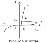 Участок АВ: U > Uмакс , 0 < I < Iуд, динистор начинает открываться.