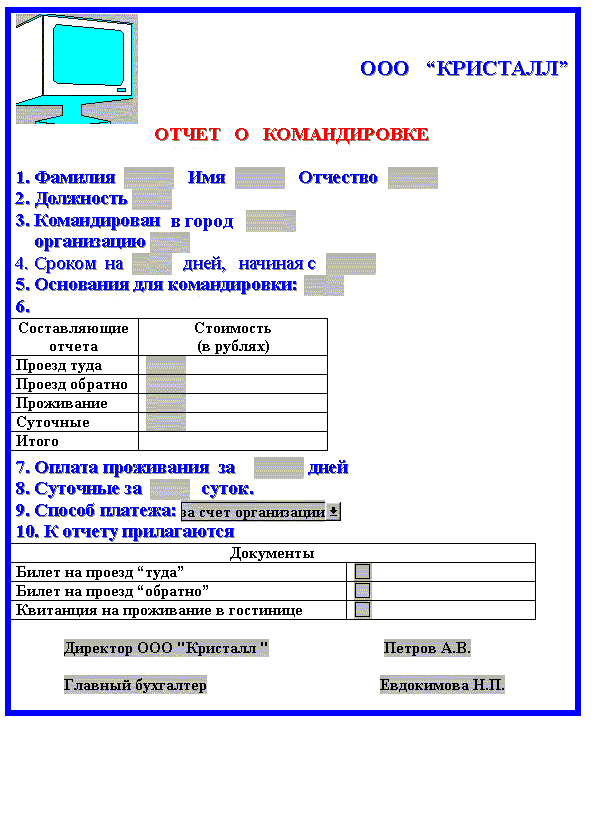 Создайте форму Отчет о командировке приведенного ниже вида, удовлетворяющую следующим требованиям: