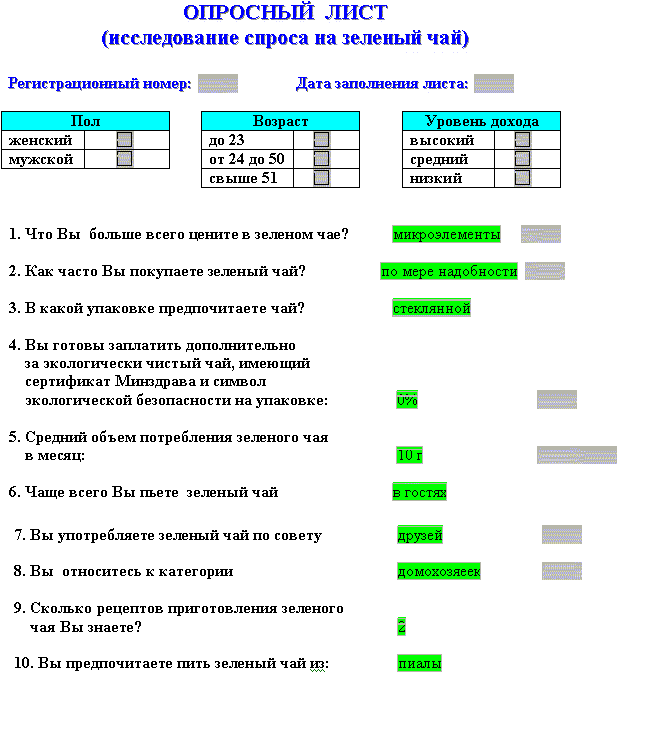 Поля в пунктах 1, 2 , 4, 5 ,7, 8 формы, выделенные серым цветом, должны быть полями типа “текст”. В эти поля опрашиваемый имеет возможность поместить свой вариант ответа.