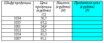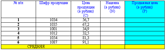 Определите среднюю цену продукции, среднюю наценку и среднюю продажную цену продукции в рублях.