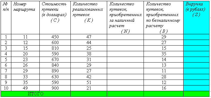 Заполните строку Итого. Подсчитайте количество путевок, проданных по безналичному расчету и за наличный расчет, общее количество реализованных путевок и выручку от подажи путевок.
