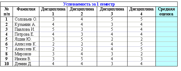 Составьте формулу и определите среднюю оценку, полученную каждым студентом за 1 семестр, результат поместите в столбец Средняя оценка Таблицы 2.