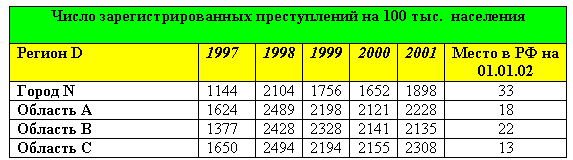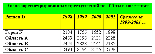 Подсчитайте среднее число преступлений на 100 тысяч населения за 1998 - 2001 годы и заполните столбец Среднее за 1998-2001 гг..