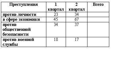 Определите количество раскрытых преступлений за два квартала по каждому виду преступллений.