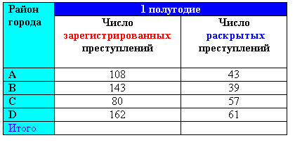 Подсчитайте количество зарегистрированных и раскрытых преступлений в каждом полугодии, а также количество зарегистрированных и раскрытых преступлений за год, заполните строку Итого.