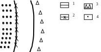 1 – зовнішній контур нафтоносності; 2 – внутрішній контур нафтоносності; 3 – нагнітальні свердловини; 4 – експлуатаційні