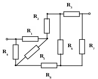 Опір резисторів R1 = R5 = R8 = 12 Oм; R2 = R6 = R7 = 6,0 Oм; R3 = 3,0 Ом; R4 = 24 Ом.