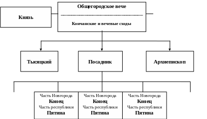Территория Новгородской республики делилась на пять частей - «ПЯТИН», которые приписывались к одному из «концов» Новгорода. Центрами «ПЯТИНЫ» были города, именовавшиеся пригородами Новгорода. В эти города направлялись новгородские наместники. Вместе с тем в них имелись собственные вечевые собрания и выборные должностные лица. «Пятины» состояли из волостей, управлявшихся новгородскими «мужами», волости - из погостов.