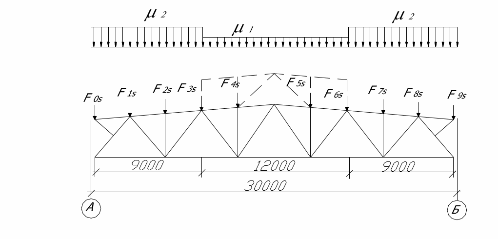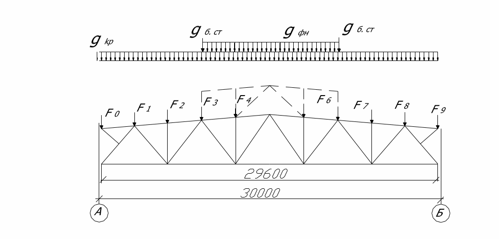 Определим силы Fi, кН, в узлах фермы, причем силы F0 и F9 приложены к колоннам и в расчете не учитываются (рисунок 8.1):