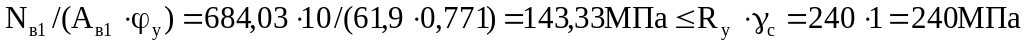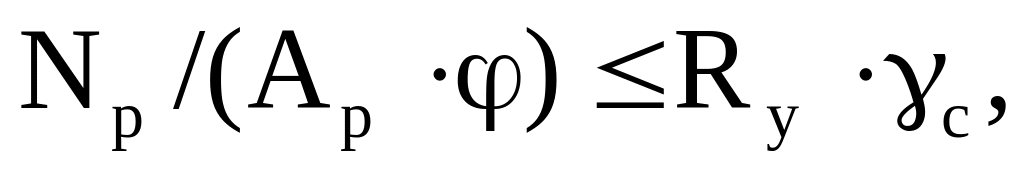 Конструктивно принимаем стойки из уголков 63х6, Ас = 7,28см2; imin = 1,24см; max=lp/imin = 100 /1,24 = 80,65; = 0,6812.