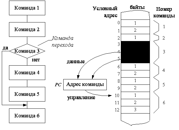 3-бұйрық 3 байт пішімінде және шартты ауысу бұйрығы болсын делік. Бұл бұйрықтың екінші және үшінші байттары 6-бұйрықтың адресінен тұрсын. Сонымен 3-бұйрықтың толық алынған кезде келесі әрекет орындалады: PC= PC + 3 (бұл 4-бұйрықтың адресі болады). 3-бұйрықтың орындалу барысында кейбір шарттардың тексерілуі жүреді. Шарт ақиқат болған жағдайда РС тіркеушісінде 3-бұйрықтың адрестік бөлімінде сақталатын жаңа адрес,яғни 6-бұйрықтың адресі жазылады. Сондықтан адрестен алынатын келесі бұйрық 6-бұйрық болады, яғни басқаруды алгоритмнің қажетті жеріне берілуі орындалады. Тексерілетін шарт жалған болған кезде, бұйрық есептегішінің құрамы өзгермейді және келесі орындалатын 4-бұйрық болады.