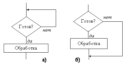 6.6-сурет. Деректердің даярлығын күтетін алмасудың алгоритмдік сұлбасы: а) «айналымды» опрос; б) периодтық сұраныс.