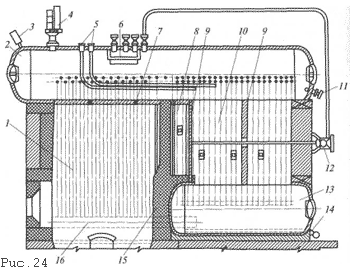 13-нижний барабан; 14-трубопровод периодической продувки; 15-кирпичная стенка; 16-коллектор.