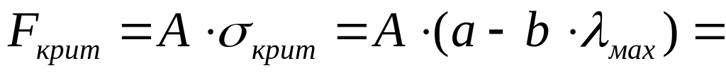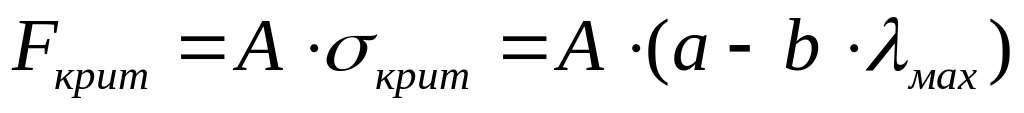 Определим величину критической силы. Для этого из справочника выпишем значения λ0 и λпред для Ст. 2: λ0=60, λпред=105. Гибкость стойки , т.е. попала в интервал между λ0 и λпред и относится к стойкам средней гибкости. Величина критической силы рассчитывается по формуле Ясинского: