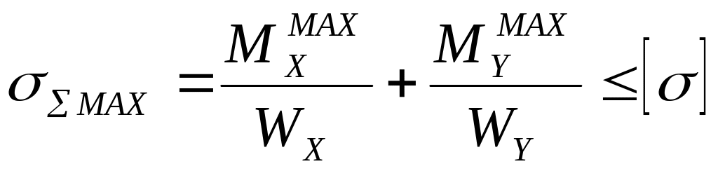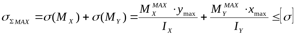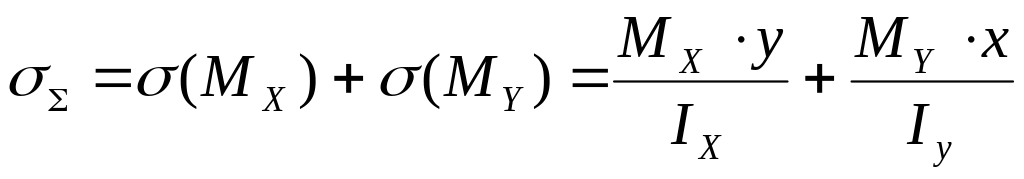 Напряжения при косом изгибе в любой произвольной точке поперечного сечения определяются как алгебраическая сумма нормальных напряжений от каждого изгибающего момента, создающего прямой изгиб: