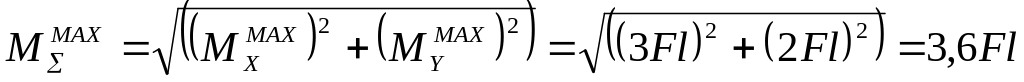 Из эпюр видно, что опасное сечение находится в заделке с моментами МХ=3Fl и МY=2Fl.