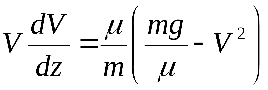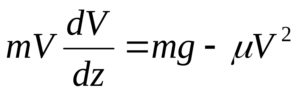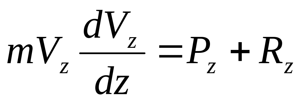 Далее находим: Pz = P = mg, Rz = - R = -μV2 , подчеркиваем, что в уравнении все переменные силы надо обязательно выразить через величины, от которых они зависят. Учтя еще, что Vz =V, получим