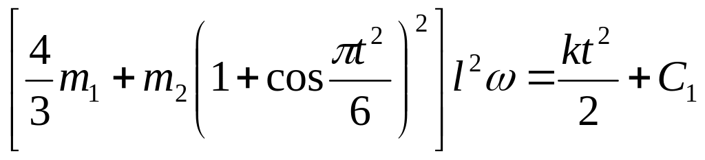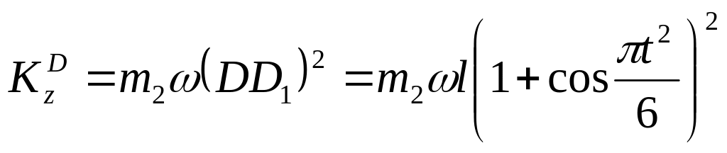Примечание. Из полученного результата можно найти и значение ω1 при t = t1. Но если по условиям задачи одновременно М = 0, то уравнение (10) дает Кz = const, и тогда обычно проще не искать зависимость ω от t в общем виде, а сначала определить положение груза D npu t = 0 (т.е. угол φ0 ) и вычислить значение Kzo при φ = φ0 и ω =ω0 с помощью равенств, аналогичных (11) — (15); затем определить положение груза при t = t1 (угол φ1) и тем же путем найти Kz1 при φ = φ1 и ω = ω1. Так, в рассмотренном примере при t = 0 будет φ0 = π/2 и DD1 = 2l (рис Д2в),а при t = t1 = 2 с будет φ1 = — π/6 и DD1 =l/2. Тогда